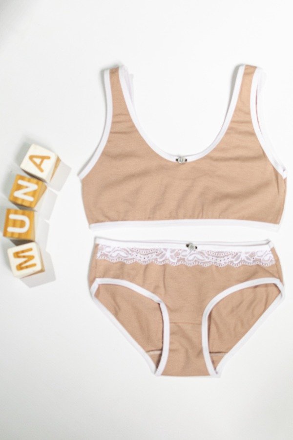 Conjunto Top y Bombacha en algodon lycra con detalle de puntilla y flor de raso hecha a mano.